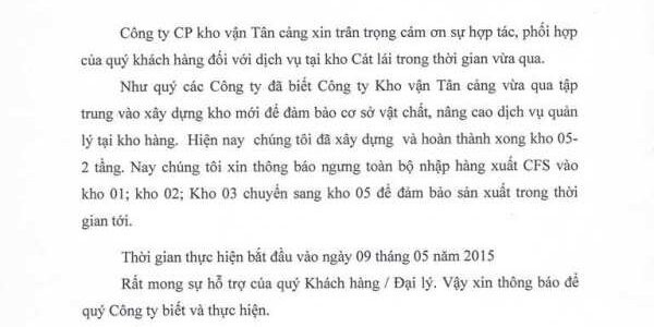 Theo thông báo của Tổng Công ty Tân Cảng Sài Gòn, Cảng Cát Lái sẽ ngưng toàn bộ nhập hàng xuất CFS vào Kho 01; Kho 02; Kho 03, chuyển sang Kho 05, cửa số 5, Cát Lái
